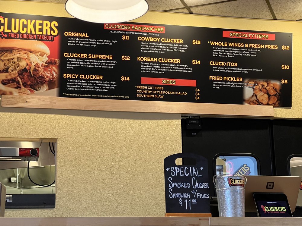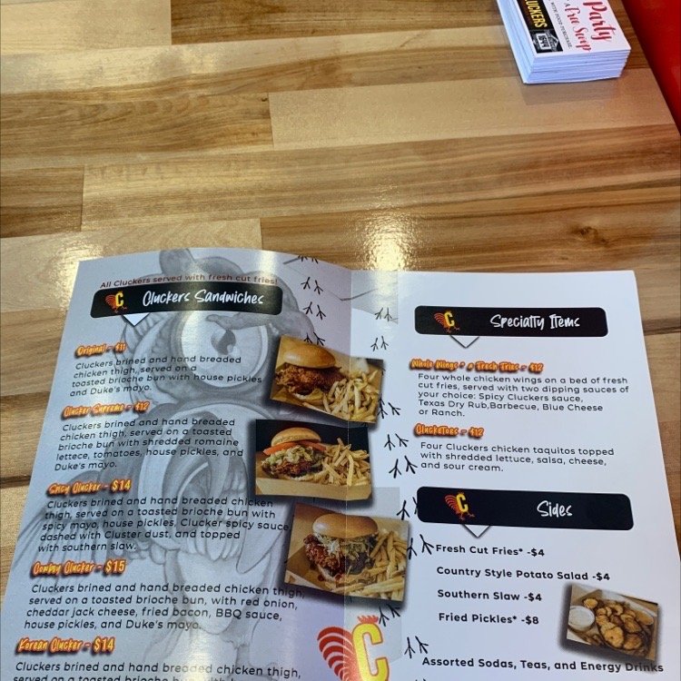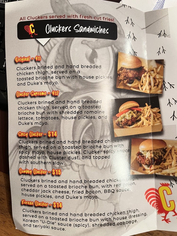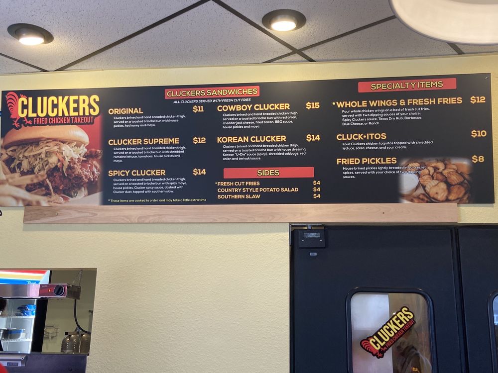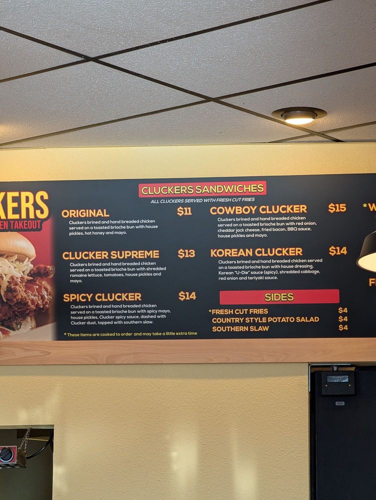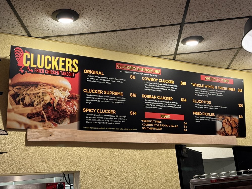 The menu features standout items like the SPICY Clucker, a jumbo chicken thigh sandwich paired with tangy slaw and spicy sauce, and the Clucker Supreme, complemented by house-made French fries. Don't miss the crispy chicken salad for a lighter option, or indulge in the whole chicken wings, served with celery, carrots, and dipping sauces.